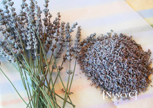 When the lavender has fully dried, you can easily remove the lavender buds by rubbing them off the stems. Remove the buds from all the stems, and make a little mound with all the buds (the lavender smells so good when you’re rubbing them off the stems!).