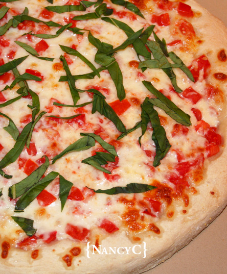 The hardest thing was deciding which recipe to try first…there’s the the Four Cheese Tomato-Top Pizza, Italian Beef Pizza, Carbonara Pizza, Spicy Thai Peanut Chicken Pizza, Spinach Pesto Pizza, and Muffaletta Pizza, to name a few. I finally decided on the Pizza Margherita, because all the ingredients–fresh basil, tomato, mozzarella, and garlic–are favorites of mine. In the cookbook, it’s described as “A classic pie that is both rustic and elegant in its simplicity.” I like rustic and simple! 🙂