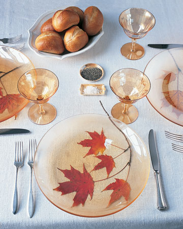 I really liked this idea of using vivid fall leaves, clipped right from your own tree, and arranging them over a plate or charger. Then just add a clear glass plate on top of the leaves. You couldn’t buy plates any nicer than that!