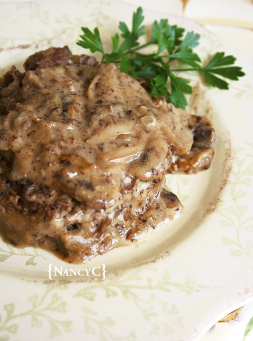 I’m not a big beef eater, but when I saw this recipe I had to try it! I found it at Campbell’s Kitchen, and it sounded good, quick, and easy. I love mushrooms and the words Mushroom-Smothered sure caught my attention! 🙂 When I do cook with beef, I like to use lean beef that is free of hormones and antibiotics. This recipe is all made in a skillet, so no baking is involved. With the creamy mushroom gravy, the taste of these burgers remind me of meatballs stroganoff.