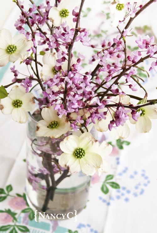 • The white blossoms are from Dogwood trees and the pinkish-red are from Redbud trees! But you can make a bouquet with whatever flowering branches you have near you!