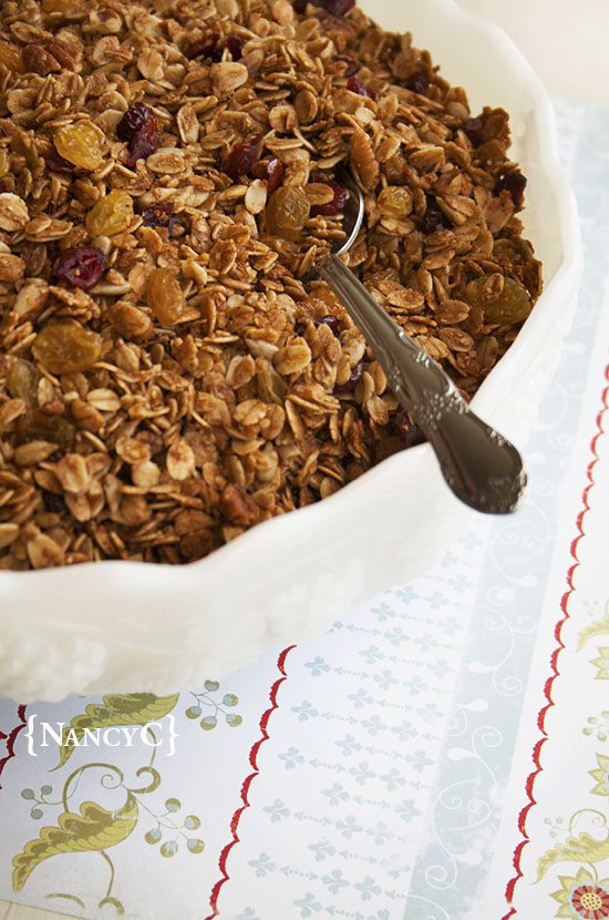 As you might be able to tell from my photo, I mixed in both dried cranberries and golden raisins into my granola.  I really like the sweetness and color they add. I also like the rich molasses flavor blended with the other spices in this recipe!