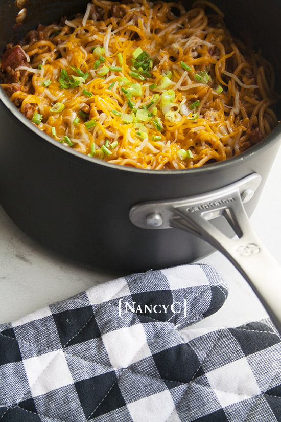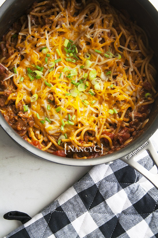 When the weather is cold, I crave comfort food. Something that warms me up and usually has cheese in it! Like this Cheesy Taco Spaghetti. It has a great Tex-Mex flavor and it’s so easy to make—it’s made in one pot so there’s minimal clean up. Easy to make,