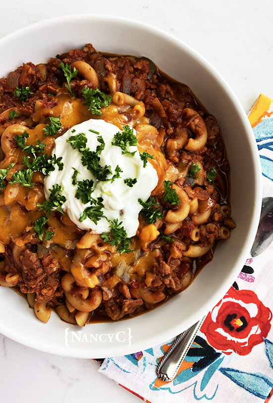 The cheesiness comes from the shredded Sharp Cheddar cheese that you sprinkle on top, right before serving, letting it get nice and melty over the Goulash. The sour cream and fresh chopped parsley are great toppings too! I’m not sure if these garnishes are traditionally used on Goulash, but they sure add to the flavor!