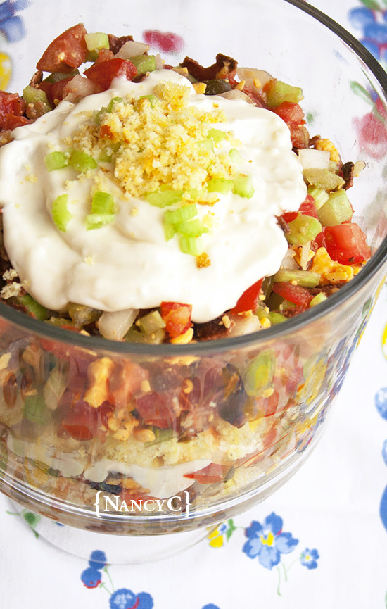 For Salad: In large clear bowl, place half of the crumbled cornbread (2 cups). In separate bowl, combine remaining ingredients and spoon half of the mixture over the cornbread. Spread half of the dressing over the vegetables. Repeat layers. Instead of spreading the top layer of dressing over all the veggies like the original recipe, I heaped it in the center, as you can see in the photo. Then I added a little finely chopped celery and crumbled cornbread for a garnish. Chill 2-3 hours before serving.