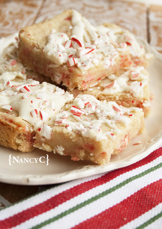 I always end up with quite a few candy canes during the holidays. This year I bought those mini-candy canes and still had a box of them left! Since I love shortbread, I thought it would be fun to try making some candy cane shortbread. The candy canes in the batter seem to make these bars a little more moist and chewy than your typical shortbread and they are very rich and buttery! Crushed candy canes are mixed into the batter and sprinkled on top. Also on top is a generous drizzle of melted snowy white chocolate. A very Christmasy cookie bar indeed!