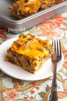 I’ve had this recipe for a loooong time—someone I used to work with gave it to me. It started out as a very bready breakfast casserole, but I made some small changes to it over time and I like it even more now. This recipe has more bread in it than the typical breakfast casserole, which is a plus because it nicely absorbs the egg mixture and doesn’t turn out runny or soggy. Another plus is that this recipe is so convenient to make because you can put the ingredients together the night before and just pop it in the oven in the morning!