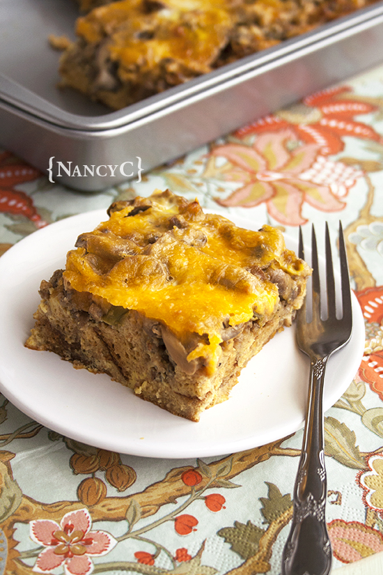 I was debating whether I should call this a breakfast casserole or something else…and then when some of my friends taste-tested it for me, they both said they liked the bready texture of this–it reminded them of bread pudding. BOOM! I thought that was the perfect way to describe this, too. A sausagey, bread pudding with cheese and mushrooms added in. Some of you may not like mushrooms–if that’s the case, I’ve noted in the recipe to chop up a red or green bell pepper as a substitute for the mushrooms. If you want to make this breakfast dish a little more eggy than bready, see the note at the end of the recipe for how to adjust it.