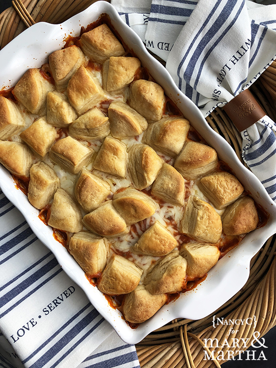 Cut the buttermilk biscuit dough in quarters and place evenly over the top of all the ingredients. Bake 350˚F for 35 to 45 minutes (I baked mine for about 38 minutes). NOTE: if biscuits are getting overly browned, you can cover the casserole with foil the last 10 minutes of baking).
