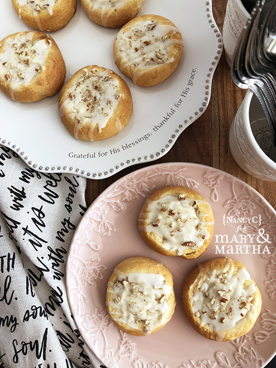 Serve them for breakfast, brunch, or a sweet snack during the day. I took some photos of the danish for maryandmartha.com and arranged them on some of their new dinnerware—the Grace & Gratitude™ Dinner Plate and the Grace & Gratitude™ Accent Plate. They make a beautiful set and the dinner plate has the words “Grateful for His blessings; thankful for His grace” along part of the edge—what a nice touch!