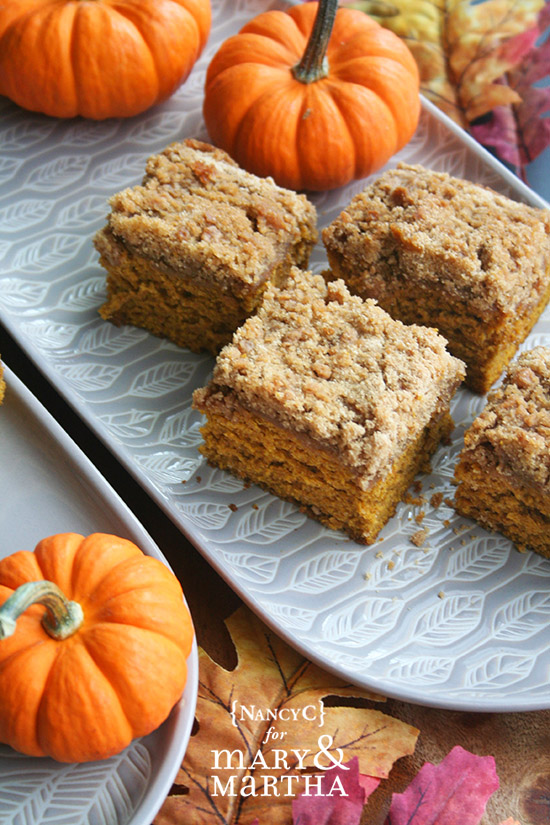 If you’re in the mood for an autumn treat, keep this Pumpkin Coffee Cake in mind! Made with canned pumpkin puree, it has some of the favorite spices of fall—cinnamon and ginger—to add to the flavor, and it’s sweetened with brown sugar. The best part, I think, is the very generous topping of streusel—yum! You just can’t go wrong with all that streusel! 🙂