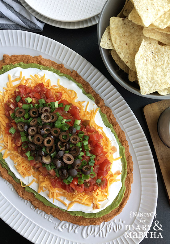 You can layer this on a larger platter or in a round 9″ deep dish glass pie plate—use a clear glass pie plate so all the yummy layers show! If you use a large platter, you can gradually make the layers smaller as you add them, so that you can see all the layers. If you use a glass pie plate, you can spread all layers to the edges, because you’ll be able to see the layers from the side of the pie plate! For the dip shown here, I used an oval platter from Mary & Martha Home, the Simply Elegant Serving Platter.