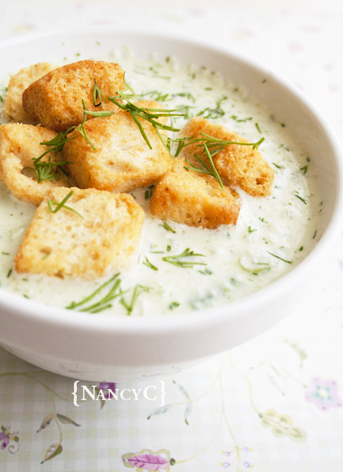 Chilled soups are perfect for summer! And if you like cucumbers, you’ll want to try this one! It also has Greek yogurt, green onions, fresh dill, and parsley in it. Lemon juice and salt give the flavor in this soup a little punch and I also added some garlic powder to the original recipe that I found in Country Living (you could also use minced fresh garlic instead of the garlic powder). The croutons on top are a nice touch, too! It’s a great summery soup to serve for a light lunch or dinner!