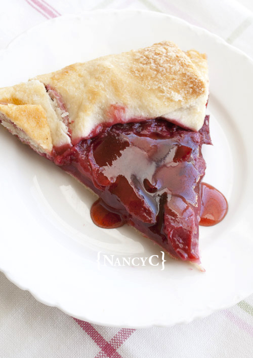 I’m not the greatest pie-maker…I still need to improve my baking skills in that area! So I thought I would attempt an easier recipe, and this Rustic Plum Tart I found at MyRecipes seemed like a good place to start. The original recipe has a note that says, “If the plums are very ripe, their juices may ooze out of the tart and onto the parchment paper [lined pan], but this adds to the desserts’ rustic charm.” When I made my tart, there was a little oozing, but not that much, and I really liked the rustic look of this tart. There’s a syrup made from the extra juices of the plums, which is drizzled over the entire tart after baking and then drizzled a little more on each piece when served. Those drizzles of syrup makes the tart really yummy!