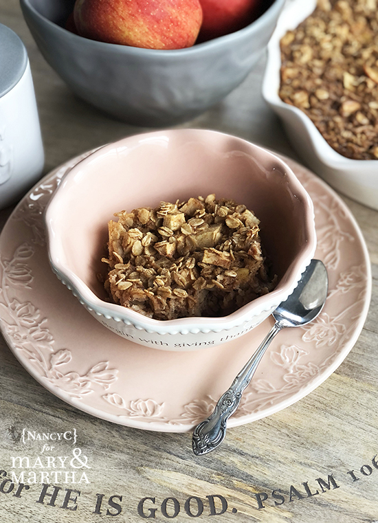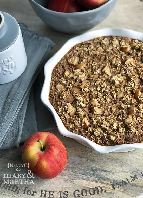 You can bake this oatmeal up in a 9″ deep dish pie plate or an 8 x 8″ baking pan. The pie plate, bowl, and other items shown in these photos are from maryandmartha.com. They have lots of beautiful products for the home with inspirational messages to encourage and inspire you. The Give Thanks Lazy Susan, shown in both photos, is one of their new products and it’s not only great for everyday use, but perfect for special holiday meals like Thanksgiving!