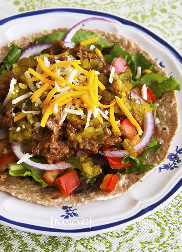 Top a tortilla with lettuce, tomato, and red onion, Add cheesy ground beef mixture and top with relish and a sprinkling of shredded cheese.