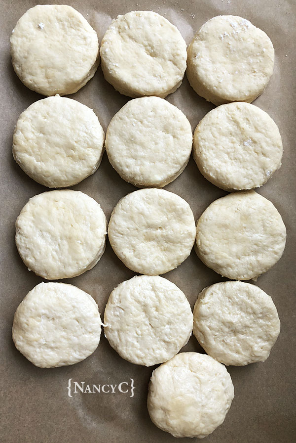 Place the dough ball on a floured surface and knead about 5 times, then roll or pat dough into a rectangular shape, about 3/4″ thick. Cut into 2 1/2″ round biscuit shapes—you can use a biscuit or cookie cutter, or a glass or jar rim, coated with flour. You’ll need to re-roll the scraps of dough to get enough biscuits—just form the scraps into a smaller rectangle or square and roll and cut remaining dough. You should be able to cut a total of 12 to 13 rounds of biscuit dough.