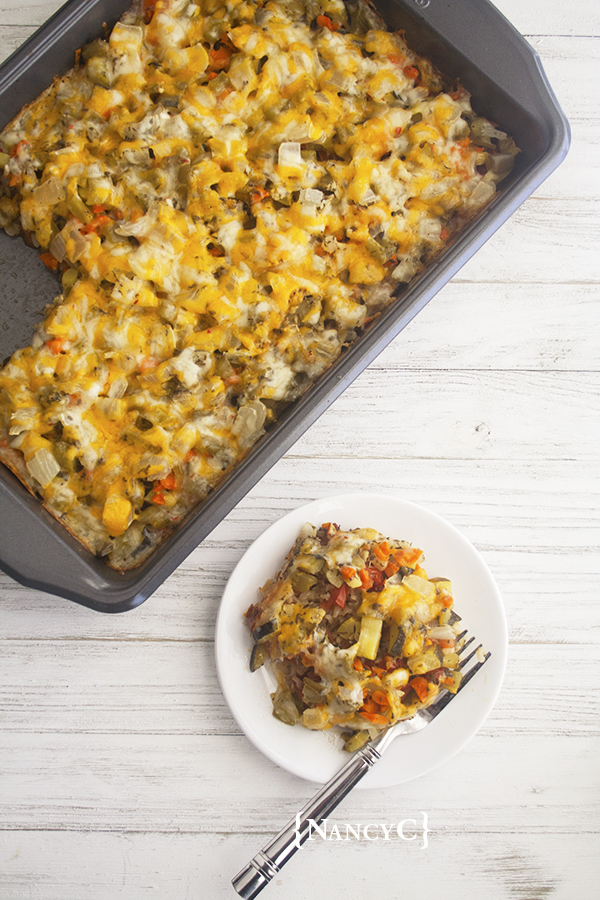 The veggies used in this recipe include tomatoes, zucchini, carrots, bell peppers, and onion, so there’s a good variety. And you can easily substitute other veggies in this. Parsley, thyme or basil, garlic, and a little salt and pepper also add to the flavor. And of course the cheese—Sharp Cheddar or Pepper Jack are great sprinkled on top of this—I like to use 1 cup of each! Another tip: make it a meal instead of a side dish by adding 1 1/2 to 2 cups of chopped, cooked chicken as a layer.