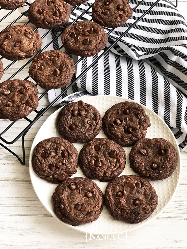 I used semi-sweet chocolate chips to mix into the batter for extra chocolate flavor, but you could use milk chocolate, dark chocolate, or white chocolate chips instead, if you like. Using a cookie dough scoop also helps give the cookies a nicer shape, so do use one if you have one!