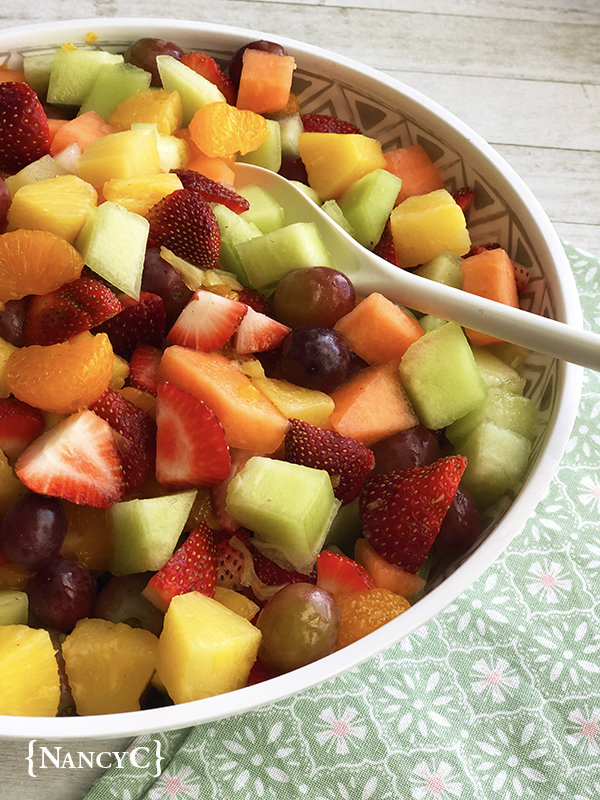 I first made this fruit salad a few months ago for a get-together, and I just kind of created this “recipe” as I went along. My goal was to make an easy, colorful fruit salad. I knew I wanted to use cantaloupe and honeydew melons and red grapes, and I thought strawberries would add a nice pop of color. Mandarin oranges sounded good too, and I used canned mandarins in light syrup, but I drained and rinsed them off because I wanted this salad to be naturally sweet. So the sweetness in this fruit salad comes from the last ingredient, the juice from the can of pineapple chunks that are also added in.