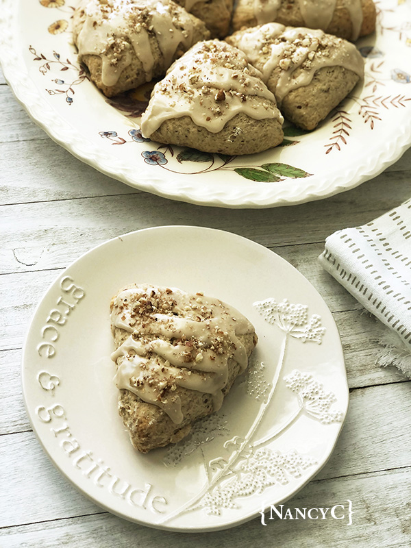 These scones are also topped with a yummy maple glaze and sprinkled with some chopped pecans (there are chopped pecans mixed into the batter too). So if you like maple-flavored treats, these scones are for you! 🙂