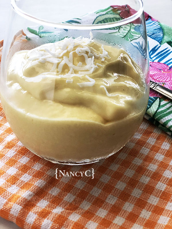 This “ice cream” is made in a blender, so it’s super-easy to make! It has the consistency of “soft serve” ice cream and you can enjoy eating it right after you’re done blending all the ingredients together! If you want to add a topping, you could sprinkle coconut flakes (that’s what I did), shaved chocolate, a dollop of whipped cream, a drizzle of caramel topping…the possibilities are endless! 🙂
