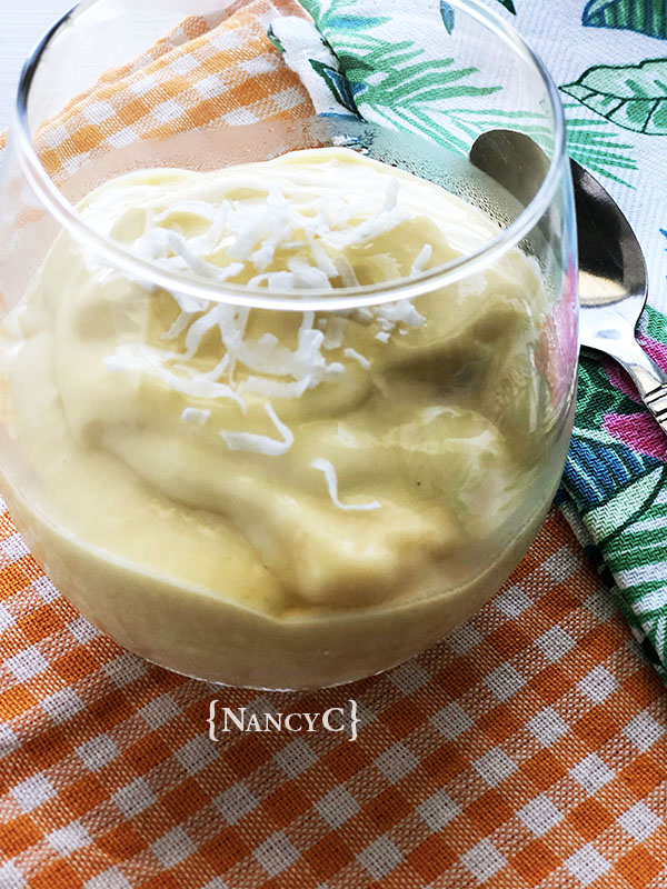 This “ice cream” is made in a blender, so it’s super-easy to make! It has the consistency of “soft serve” ice cream and you can enjoy eating it right after you’re done blending all the ingredients together! If you want to add a topping, you could sprinkle coconut flakes (that’s what I did), shaved chocolate, a dollop of whipped cream, a drizzle of caramel topping…the possibilities are endless! 🙂