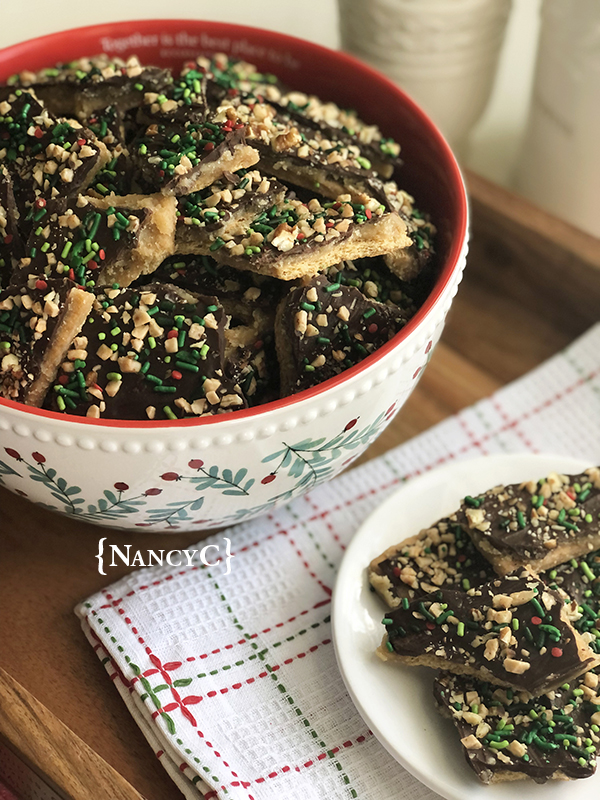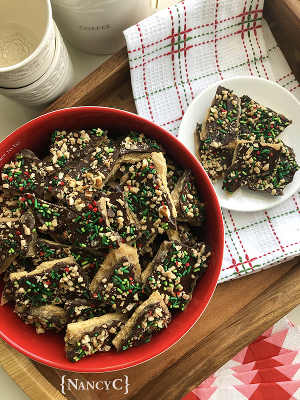 Bake at 350˚F for 7 to 8 minutes, until edges are bubbly. Remove from oven and sprinkle evenly with the semi-sweet chocolate chips. Let sit for 4 to 5 minutes, giving the chocolate chips time to melt, then spread the melted chocolate evenly over the crackers. Sprinkle with the chopped pecans and toffee bits. Add some holiday sprinkles too, if desired.