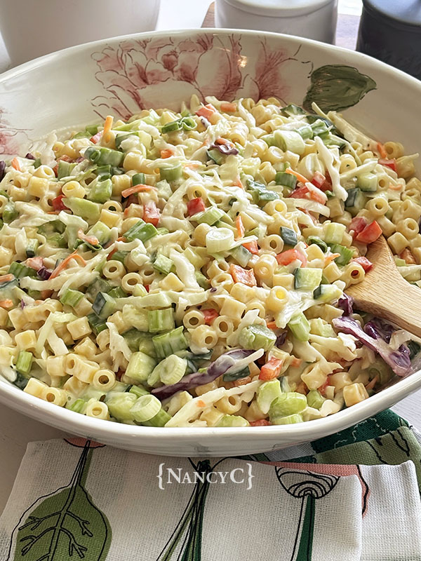 This is an easy-to-make dish, because you can use the pre-shredded, packaged cabbage coleslaw mix, which saves a lot of time! All you have to do is cook the pasta and chop some additional veggies (green onion, bell pepper, celery, and cucumber). The simple dressing is easy to make, too! Serve this as a side or light main dish for a summer lunch or dinner—if serving as a side, it goes great with burgers, hot dogs, or grilled chicken. If serving as a main dish, add some rolls or crusty bread and pour some tall glasses of iced tea or lemonade, and you have a great meal!